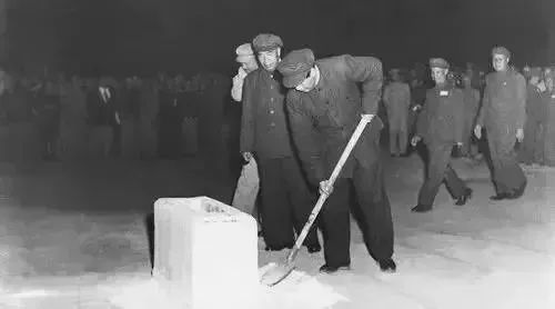 1949年9月30日,中國人民政治協(xié)商會議第一屆全體會議舉行最后一次會議。為了追念一百多年來為新中國的誕生而英勇獻身的人民英雄,這次會議一致通過了修建人民英雄紀念碑的決定。當(dāng)天會議閉幕后,毛澤東等領(lǐng)導(dǎo)同志和參加會議的代表們來到天安門廣場,為人民英雄紀念碑舉行隆重的奠基典禮。在宣讀完畢親自撰寫的碑文后,毛澤東率先鏟土覆蓋在碑基之上,為紀念碑奠定基石。