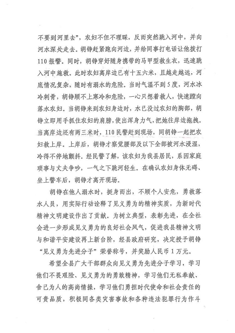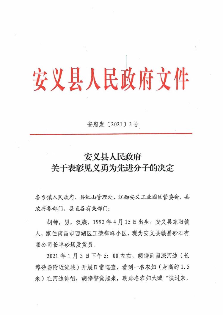 胡錚用實際行動詮釋了見義勇為的精神實質,為新時代精神文明建設作出了貢獻。為樹立典型,表彰先進,經(jīng)安義縣人民政府決定,授予胡錚“見義勇為先進分子”榮譽稱號,并獎勵人民幣一萬元。