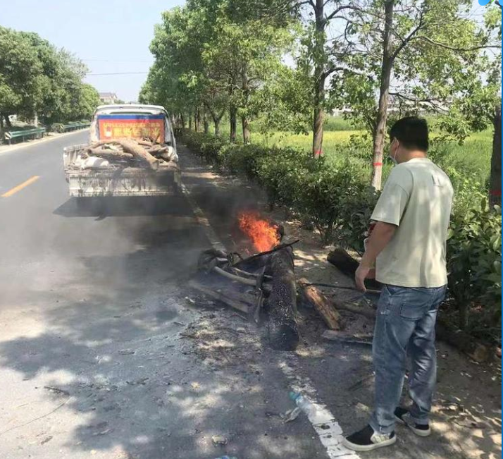 來到車前,發(fā)現(xiàn)貨車司機(jī)正在用瓶裝礦泉水澆在冒有濃煙的木柴、木屑上面進(jìn)行滅火,但濃煙越來越大,情況十分危急,胡建洋立刻去車上拿隨車干粉滅火器和水,張江南聯(lián)合司機(jī)把冒有濃煙的木柴、木屑卸到路邊上,這些木柴、木屑被扔下來沒多久,明火迅速燃燒了起來。張江南使用滅火器和水對火勢進(jìn)行壓制,經(jīng)過十分鐘的撲救,明火被完全撲滅。