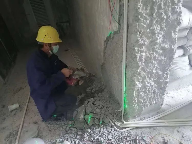 本次總部員工通道改造工程工作難度大、時(shí)間緊,一樓員工通道改造工程點(diǎn)多為整體澆筑,墻體面很難破拆,墻體線槽要定點(diǎn)埋深布局整齊,大型金屬門窗的搬遷等,都給施工過程中增加了難度,在實(shí)地操作時(shí),由于破拆墻面造成灰塵較大,部門協(xié)同建設(shè)方積極行動(dòng)起來,拿上澆灑工具,進(jìn)行地面噴淋,從而有效減少了揚(yáng)塵。