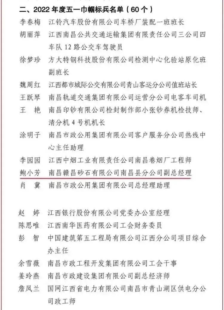 為進一步弘揚勞模精神、勞動精神和工匠精神,充分發(fā)揮先進典型和模范人物的鼓舞引領(lǐng)作用,大力營造學習模范、爭當先進的濃厚氛圍,團結(jié)動員廣大女職工立足崗位、建功立業(yè),近日,南昌市總工會公布的《關(guān)于表彰2022年度南昌市五一巾幗標兵崗(標兵)、命名南昌市女創(chuàng)業(yè)帶頭人的通報》文件,其中來自南昌贛昌砂石有限公司鮑小芳同志喜獲“南昌市五一巾幗標兵”榮譽稱號,表彰了其深耕一線,管內(nèi)務、保生產(chǎn)、促發(fā)展,兢兢業(yè)業(yè)不怕苦的奮斗精神,充分展現(xiàn)了南昌贛昌砂石有限公司‘婦女能頂半邊天’的巾幗風采。