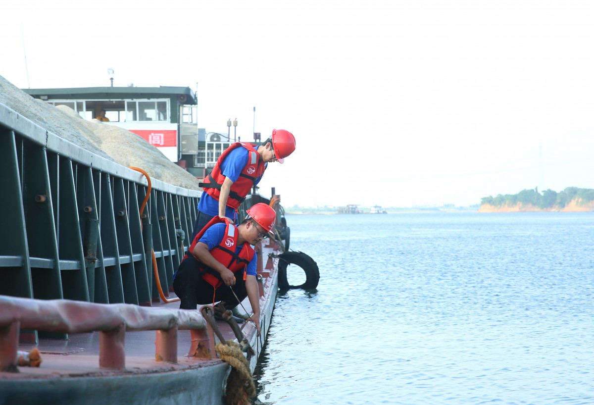 發(fā)貨員陶小毛、熊劍的身影出現(xiàn)在烈日下,在江邊等待著即將靠岸的運(yùn)力船,為了安全他們頭戴安全帽、身穿印有贛昌砂石logo的紅色救生衣、腳踩套鞋,這身裝備仿佛將他們整個人置身于密不透風(fēng)的高溫鐵桶里,即使什么都不做都能出一身汗,更別說要登上被陽光曬得燙腳的鐵皮甲板了。但他們依舊仔細(xì)核對著運(yùn)砂船的各項數(shù)據(jù),做著砂石入庫前的準(zhǔn)備,仿佛忘記從四面八方襲來的滾滾熱浪。